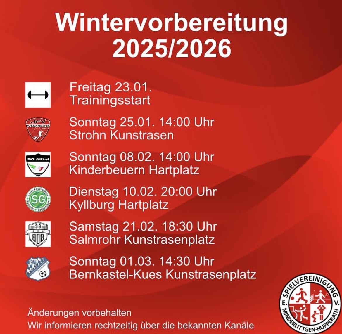 Jahreshauptversammlung mit Ehrungen am Samstag, dem 24.01.2026 – 19.00 Uhr im Mehrzweckbereich Hupperath (Verlegung von Minderlittgen nach Hupperath)